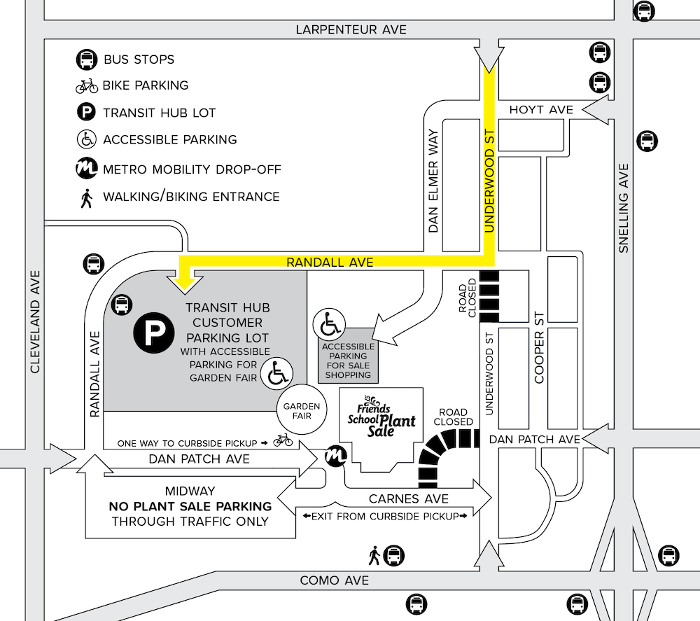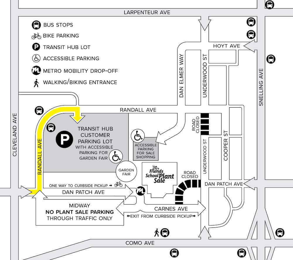 When routing to the sale's parking lot, use the address 1800 Randall Avenue, as seen below. You can also click the Directions arrow within the Google map to get directions from your location to the plant sale parking lot:
