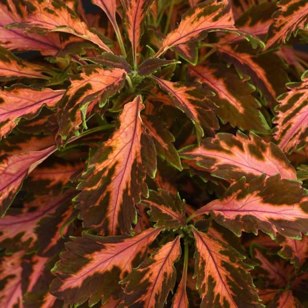 Narrow, toothed leaves are magenta to pinkish orange with reddish brown margins outlined in bright green. Cascading appearance. Keeps its unusual color scheme throughout the season and is slow to bloom.