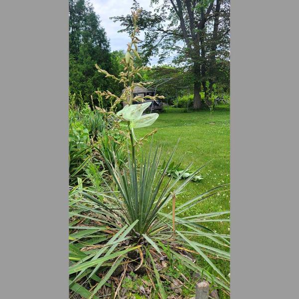 Selected for cold hardiness in Canada. Rosette of sword-shaped, spine-tipped leaves. When mature, tall stalks of fragrant white flowers bloom in summer. Likely to develop one or more woody trunks. Adam’s Needle (Y. filamentosa) heritage adds known hardiness and possibly the curly white threads the species is known for. Open-pollinated near many yucca species. Drought-tolerant and deer-resistant.