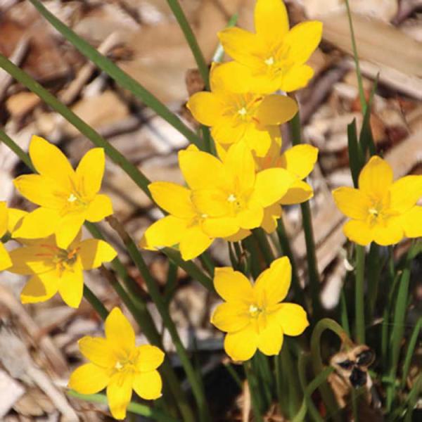 Sweet, starry 2” flowers with grassy leaves bloom late summer to fall. Expect a flush of blooming after rain. Initial growth may not appear until summer. Plant in the ground to grow as an annual, or in a pot to be moved indoors after the first frost and allowed to dry out. In spring, move the pot back outside and water. The bulbs multiply rapidly. At its best in a few years when the pot is crowded.