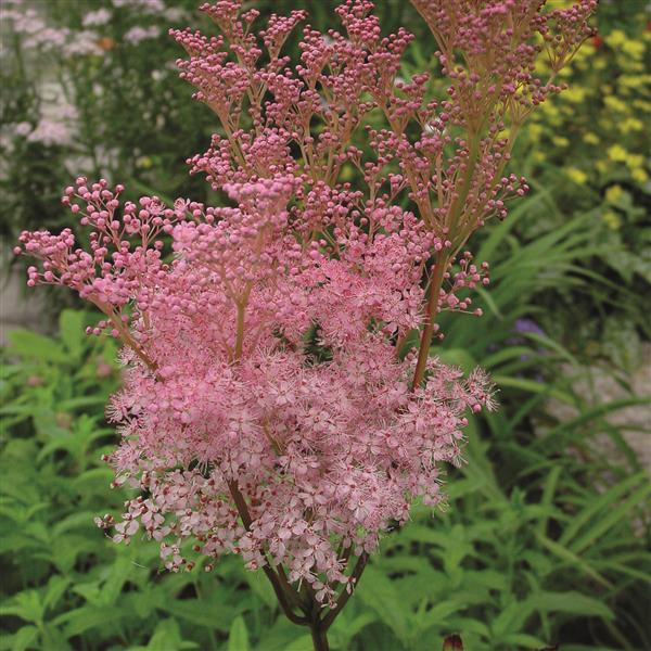 Peach-pink tiny flowers in 6–9" clusters on red stems. Cultivar of a Midwestern native.