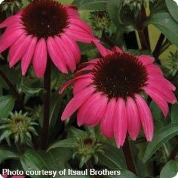 Deep magenta-purple flowers with black-red cones on black stems. Compact plant.