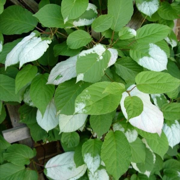 Pollenizing (non-fruiting) plant with white and pink variegated leaves, often used as a screen or shade vine because of its dense cover.